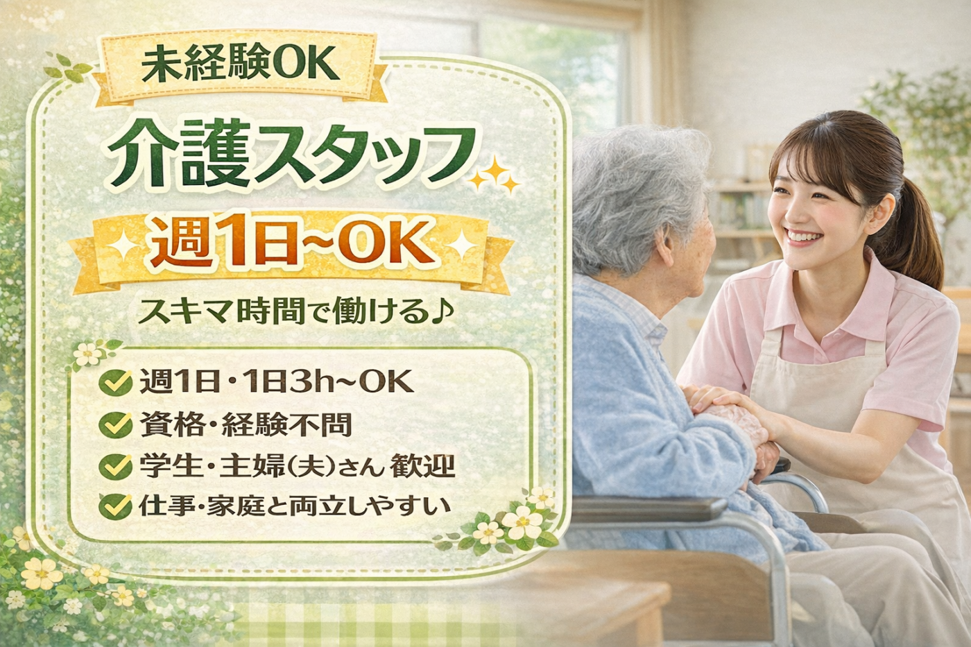 - 週1日~OKの介護スタッフ|未経験歓迎×スキマ時間で働ける