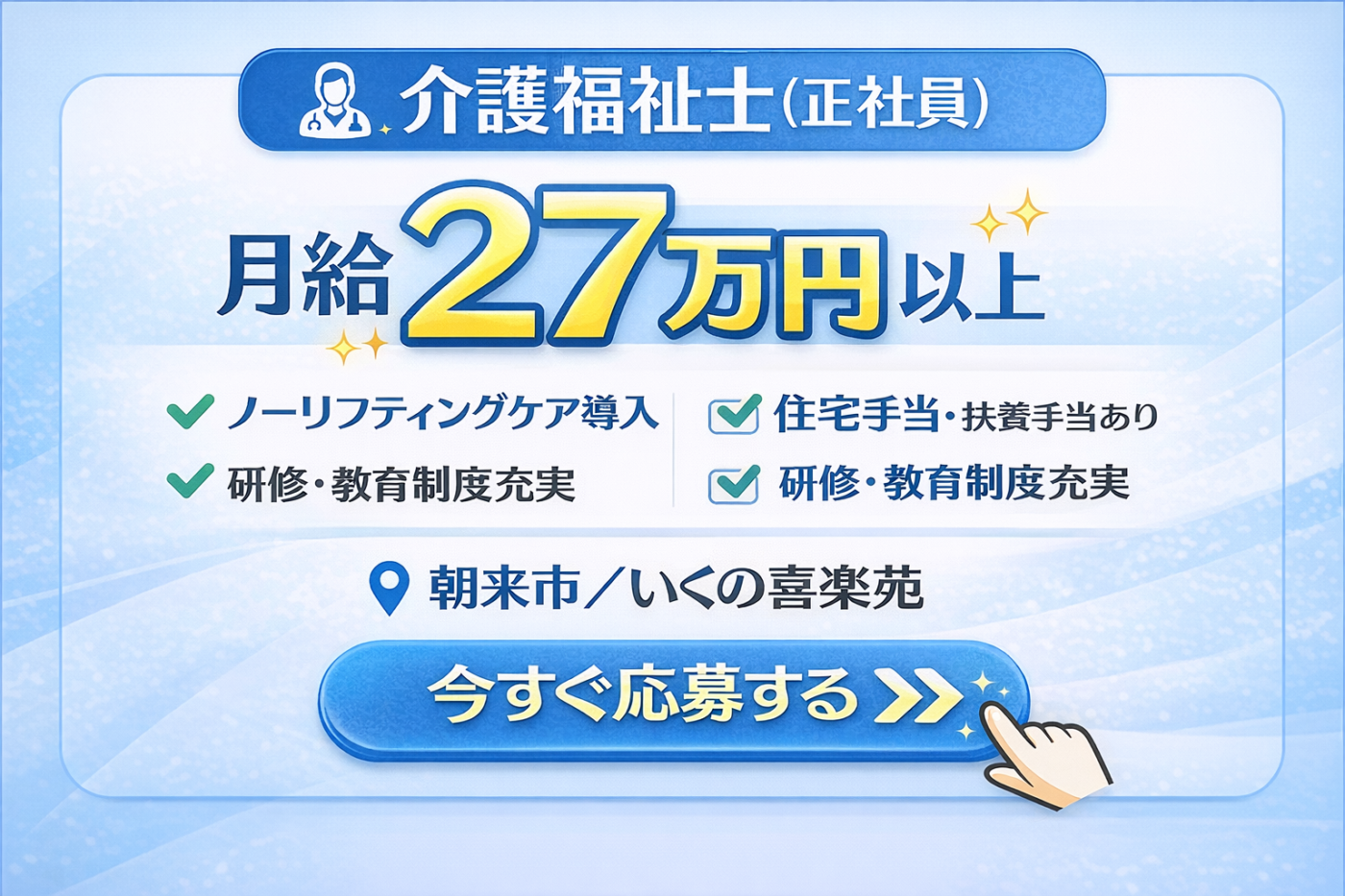 - 【月給27万円以上】介護福祉士募集|負担少ない介護◎