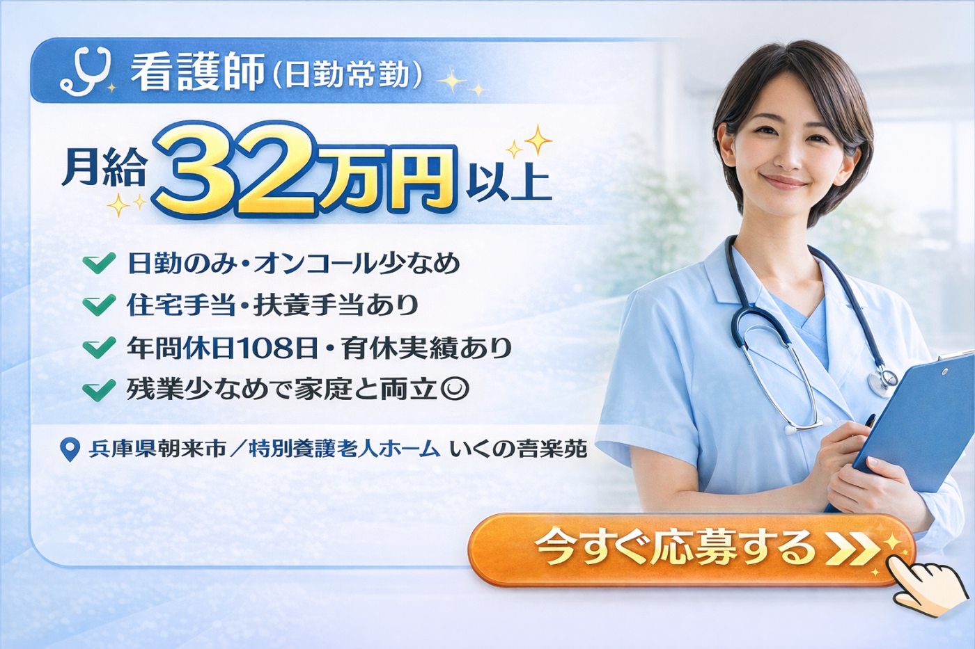 【月給32万円以上】日勤メイン看護師|特養で安定勤務◎