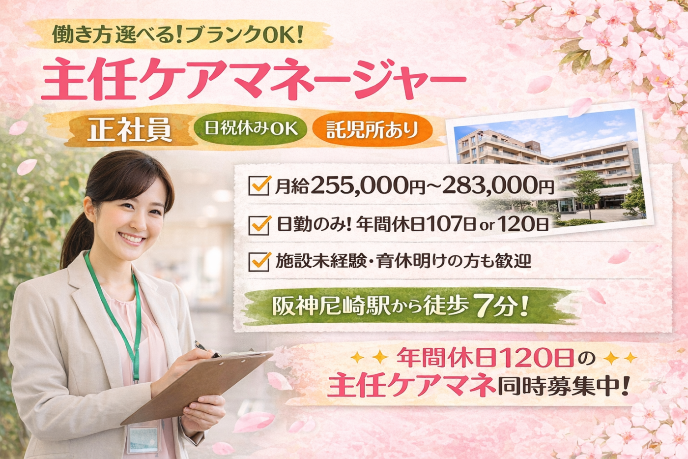 - 【主任ケアマネージャー|正社員】月給25.5万円~/年間休日120日選択可/日祝休み相談OK