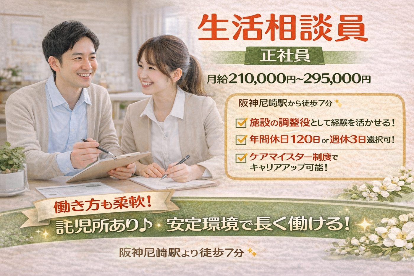 - 【生活相談員|正社員】月給21万円~/年間休日120日・週休3日選択可/託児所あり