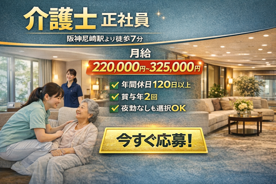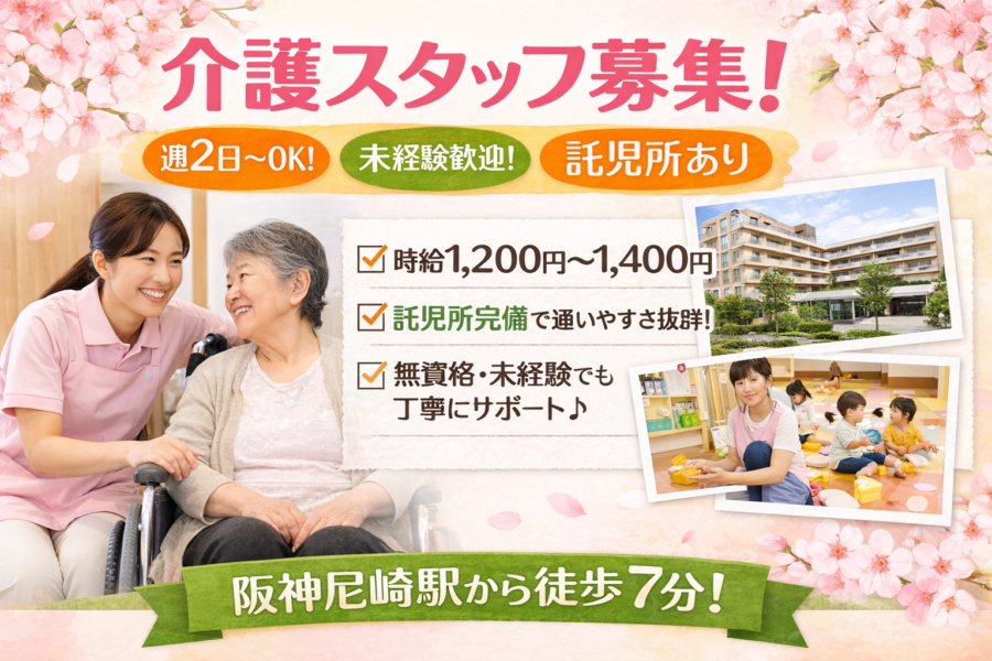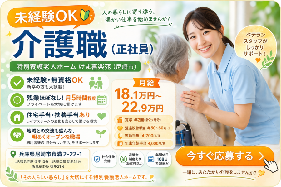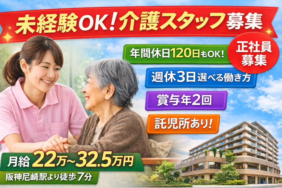 【正社員】未経験OKの介護スタッフ|阪神尼崎駅徒歩7分|賞与あり|働き方選べる
