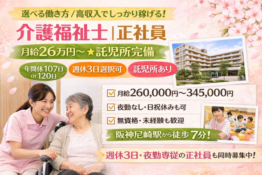 【介護福祉士|正社員】月給26万円~/年間休日107日 or 120日選択可/託児所あり