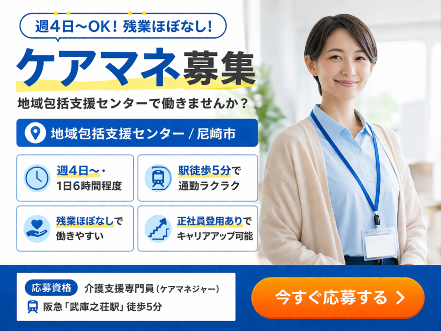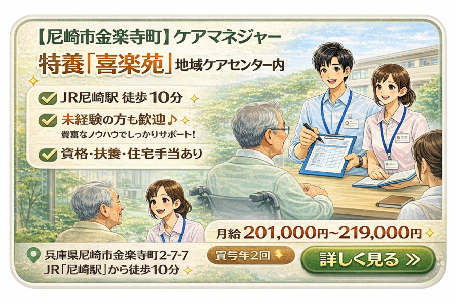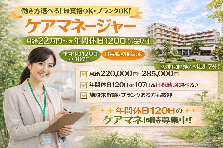 ケアマネ募集!各線西宮駅チカ・月給26万以上・賞与2回・社保完備・手当&休日休暇充実!