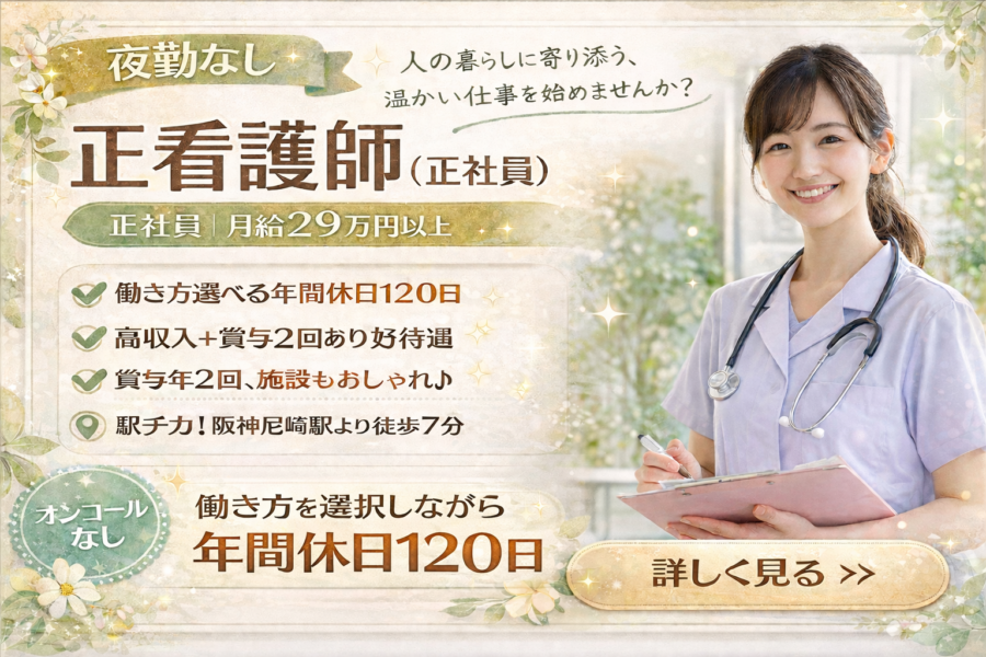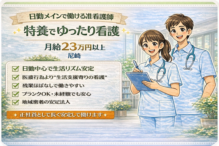 日勤メインで働ける准看護師|特養でゆったり看護|月給23万円以上|尼崎