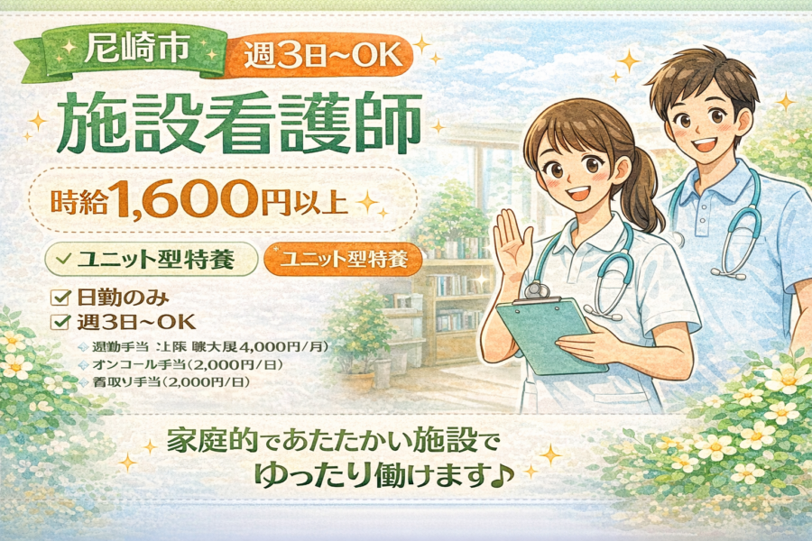 【尼崎市】週3日〜OK|未経験OKの施設看護師|時給1,600円以上◎家庭的なユニット型特養